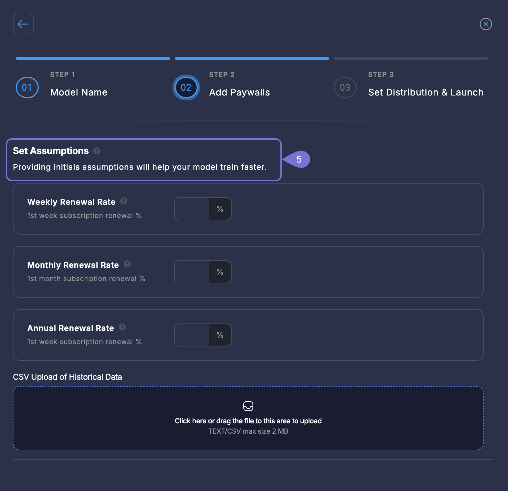 Set Assumptions for Faster Training. Under Advanced Settings, you can provide initial assumptions or upload historical data. This information helps the model train faster by giving it a baseline. This step is recommended but not required. After setting these, click Next - Set Distribution.