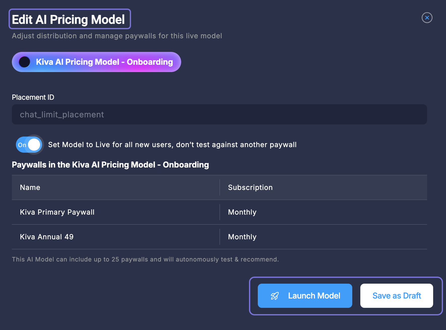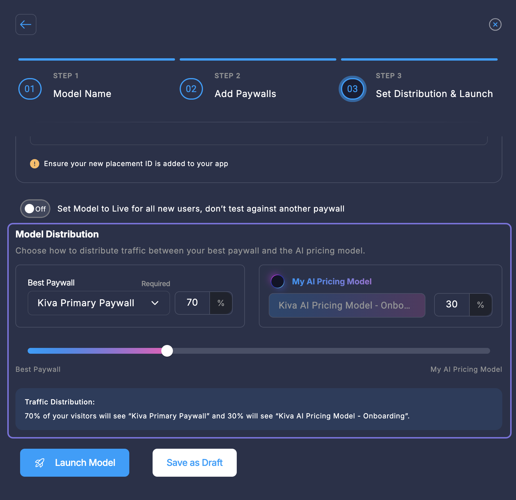 Activate the Live ToggleThe Set Model to Live for all new users, don’t test against another paywall toggle automatically sets the traffic distribution to 100% for the AI Pricing Model.