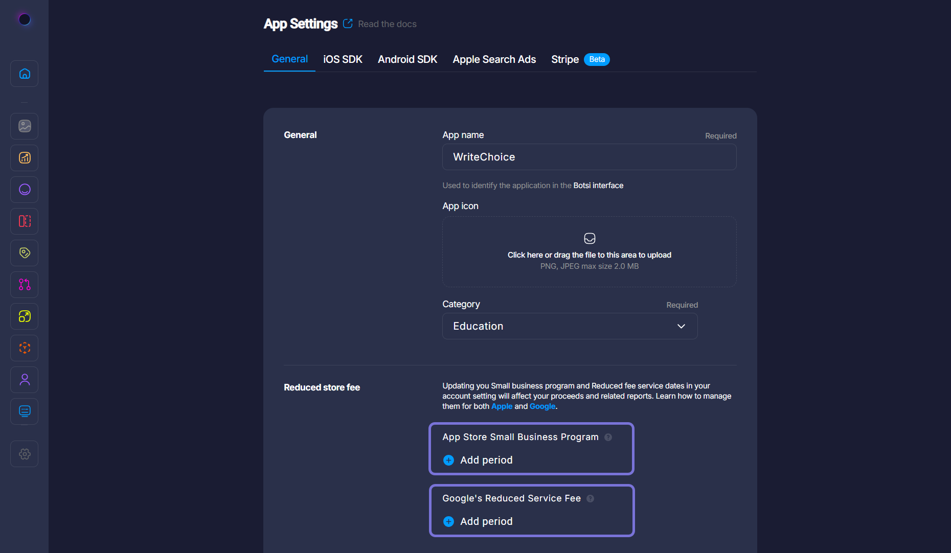 Botsi allows you to easily track and visualize your store commission adjustments based on your participation in the App Store Small Business Program and Google's Reduced Service Fee.