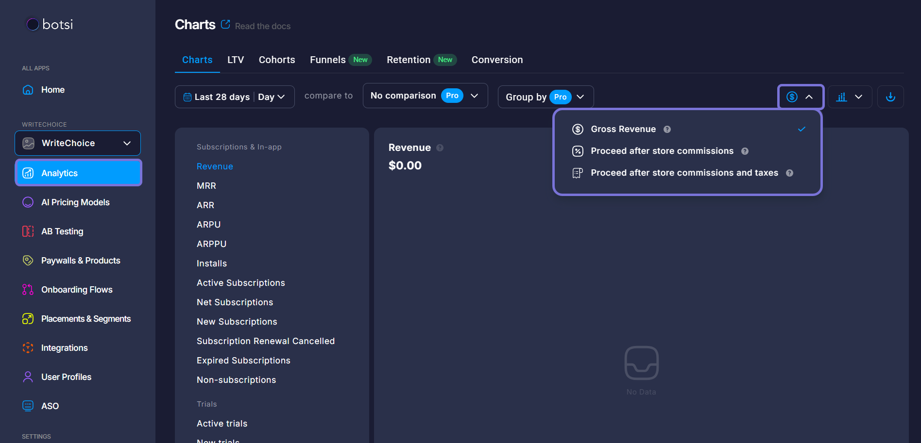 In Botsi, you can track and visualize how store commissions and taxes impact your revenue within the Analytics section. When viewing your revenue data, you can select how you want it to be displayed in charts: