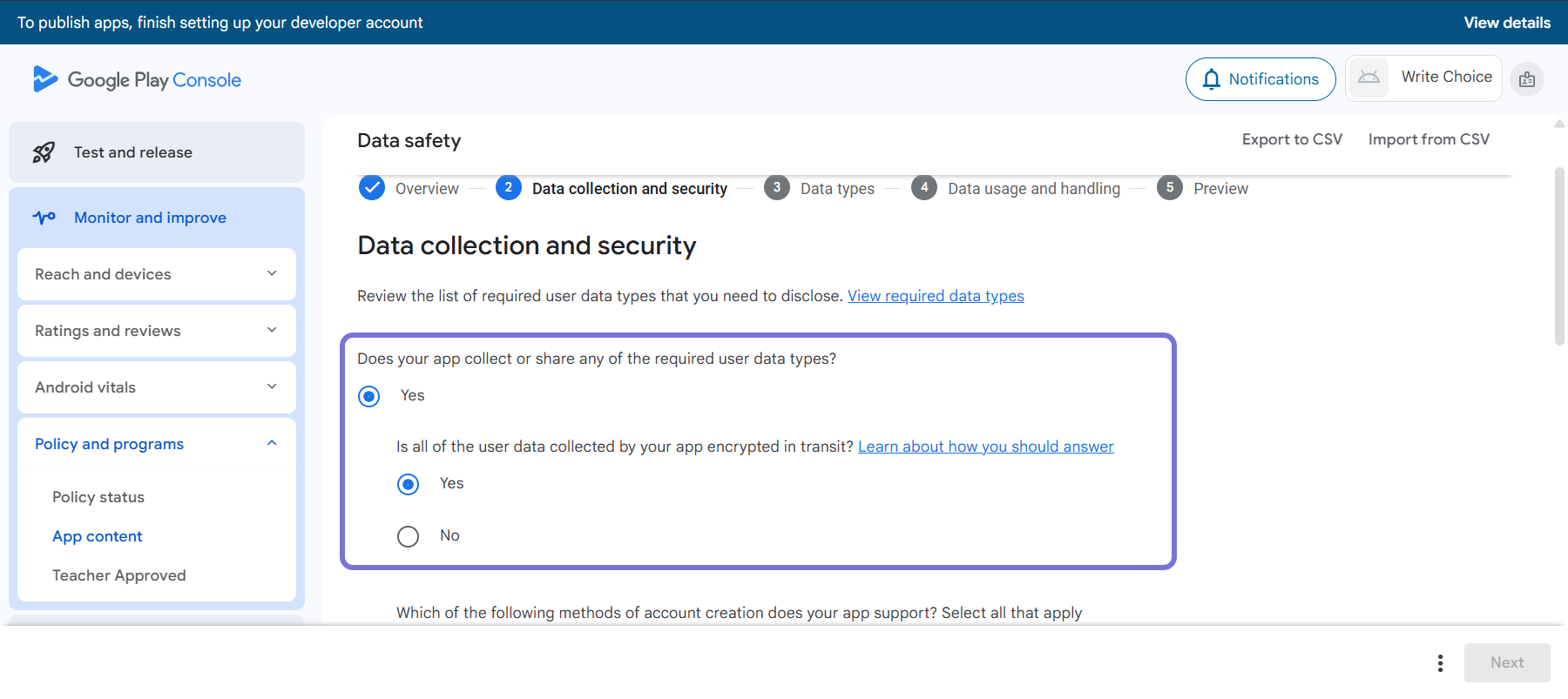 Under "Is this data required for your app, or can users choose whether it's collected", choose Data Collection is Required