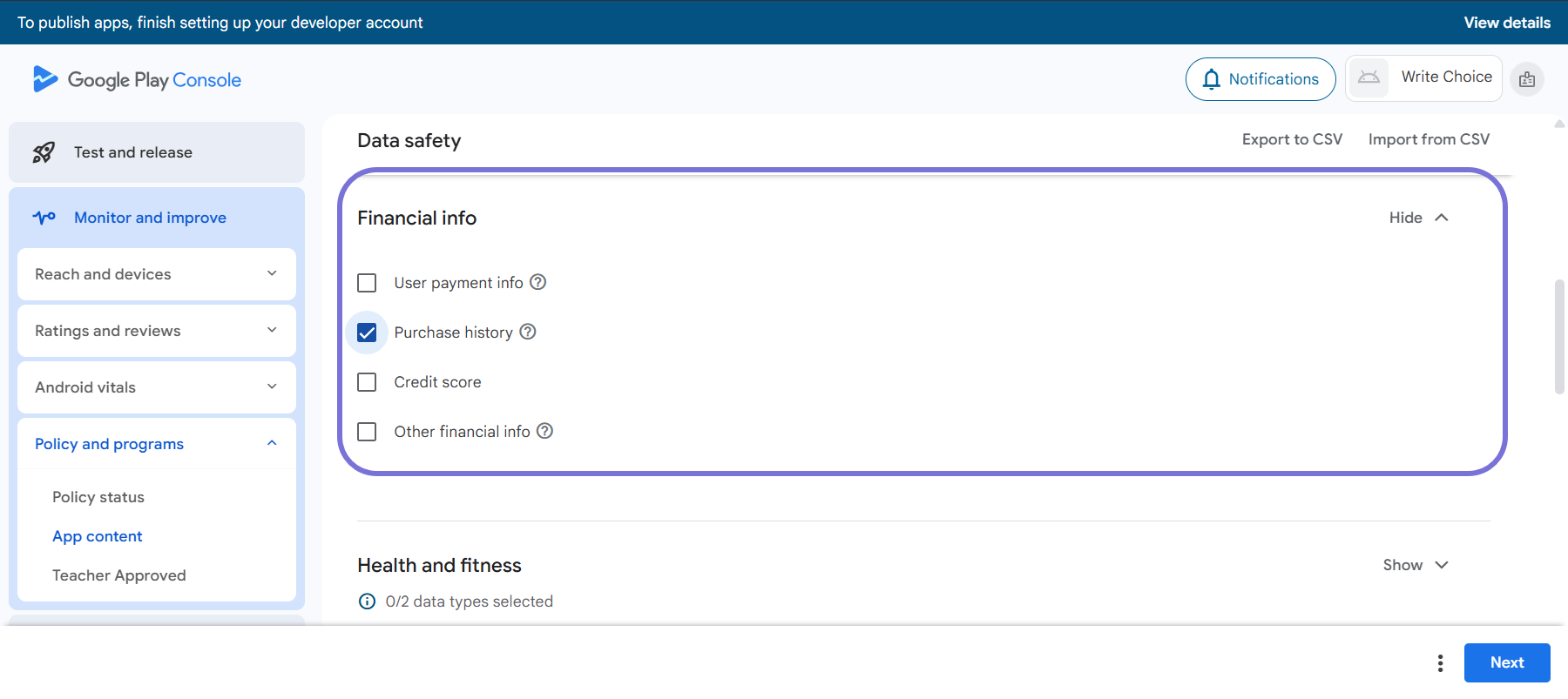 When creating your Data Safety declaration, you must disclose that your app collects Purchase history information from the Data types section in Google Play Console.