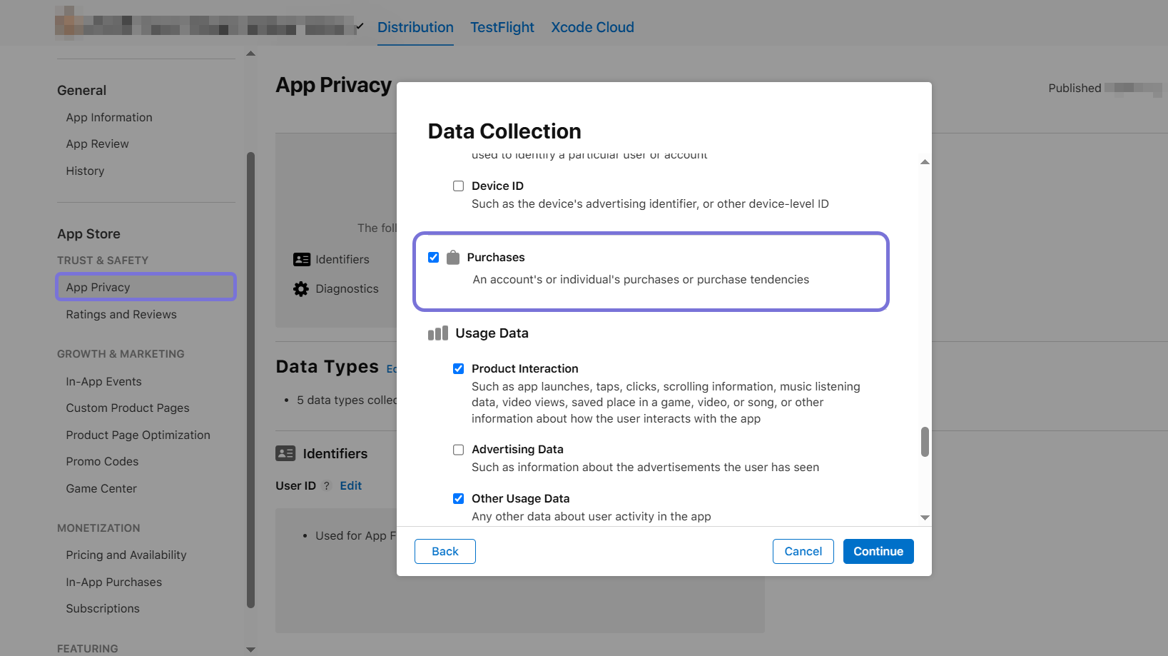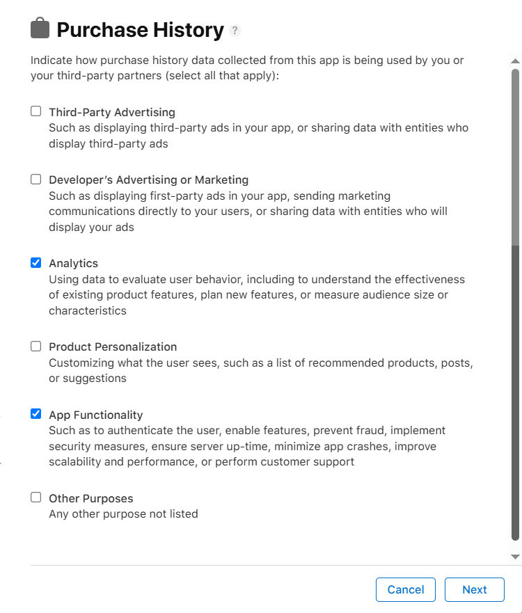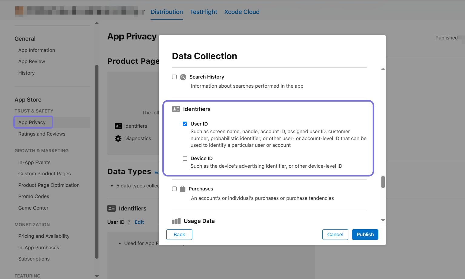 If you have linked purchase history to a userβs identity, you must disclose the type of user identifiers used in your app: