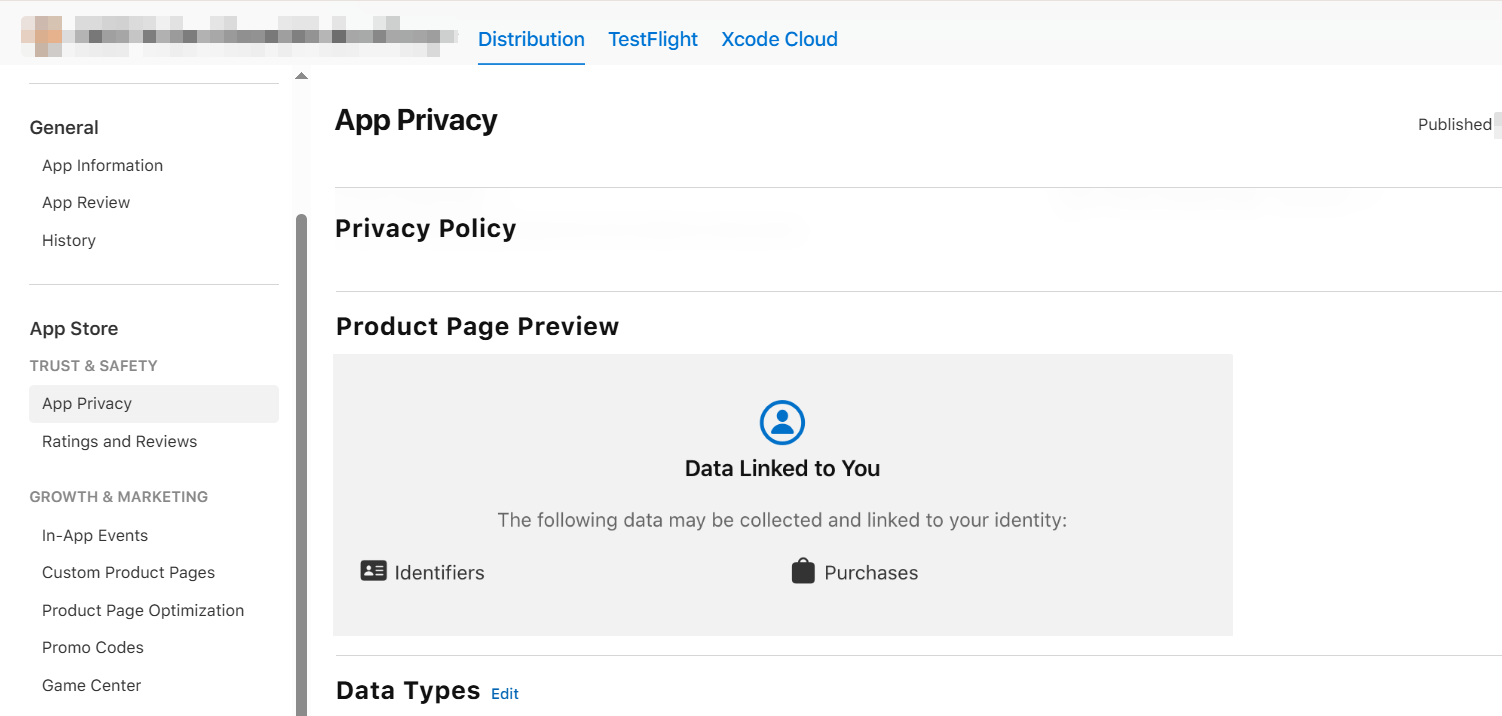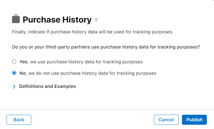 Once you have made your privacy selections, Apple will display a preview of your app's privacy details. If you have selected Purchases and Identifiers, your privacy section will look like this:
