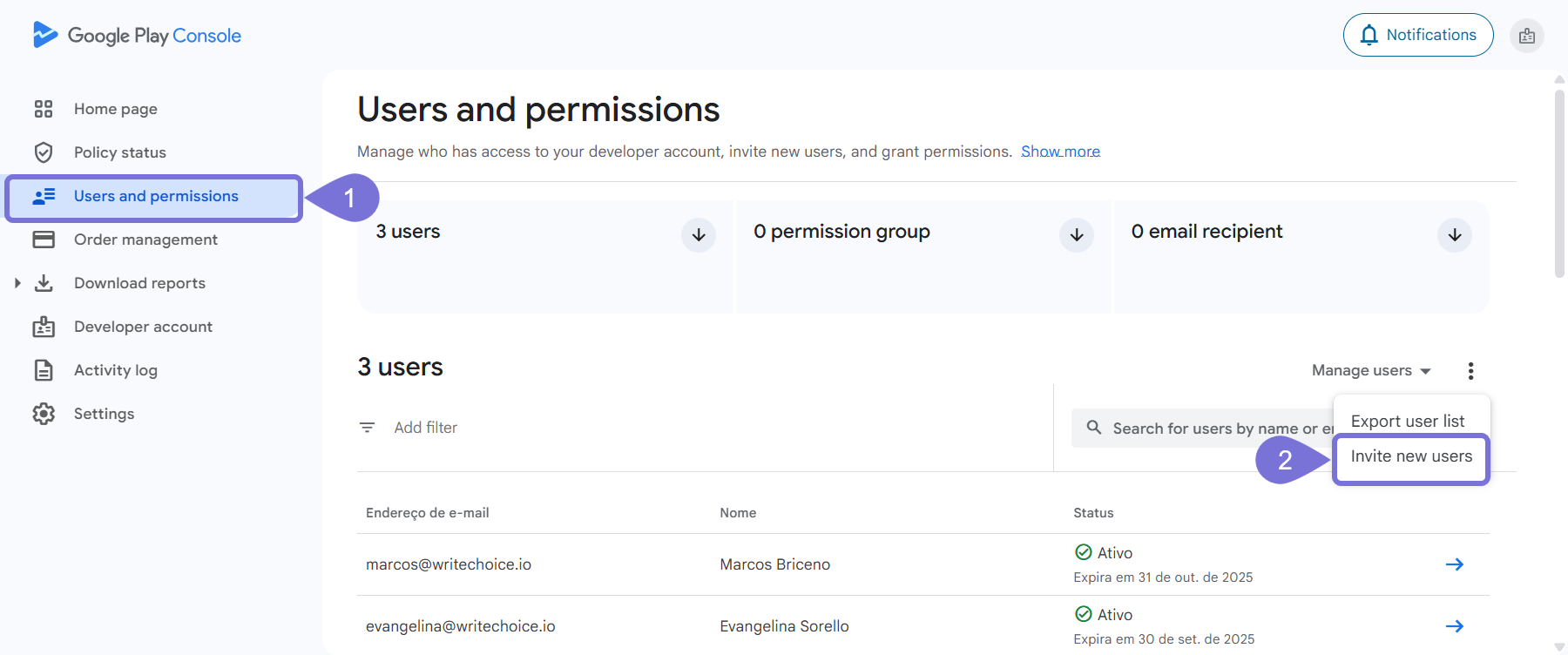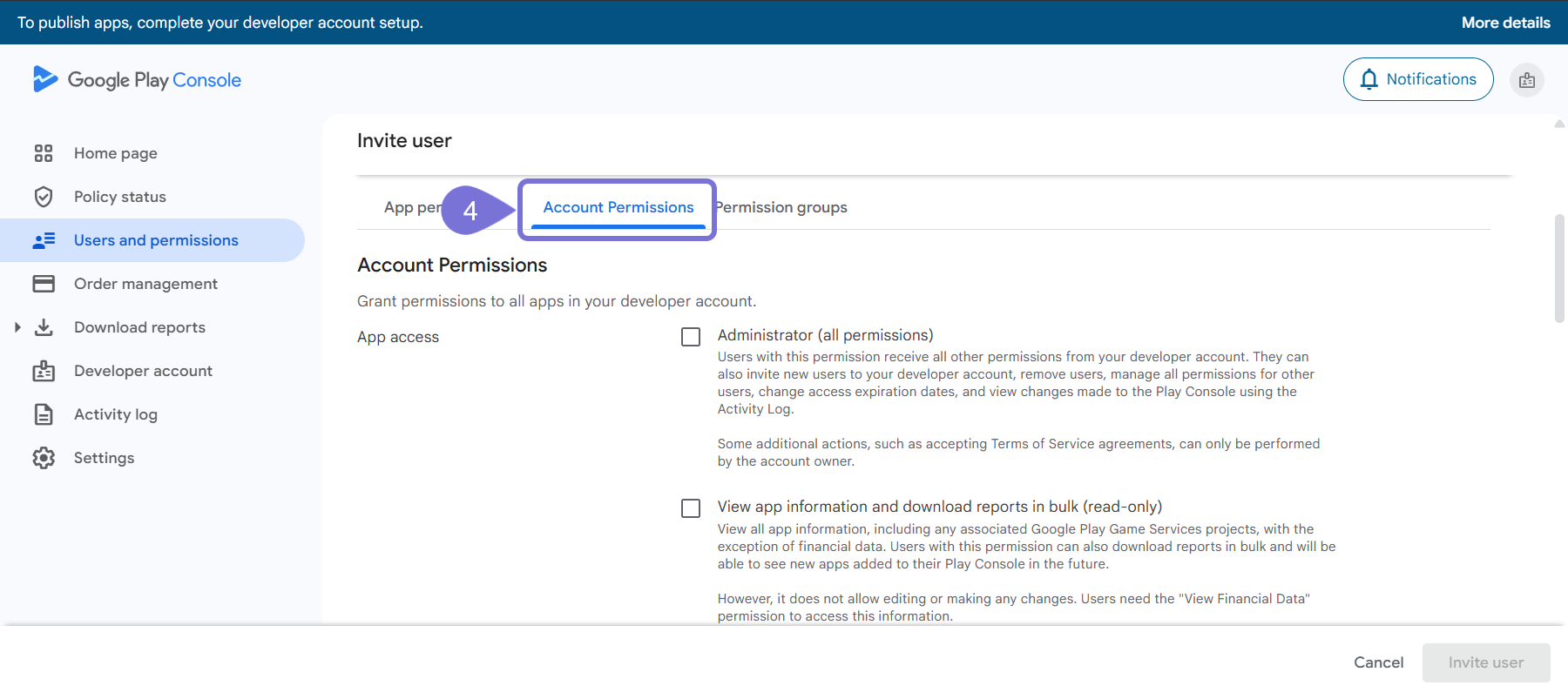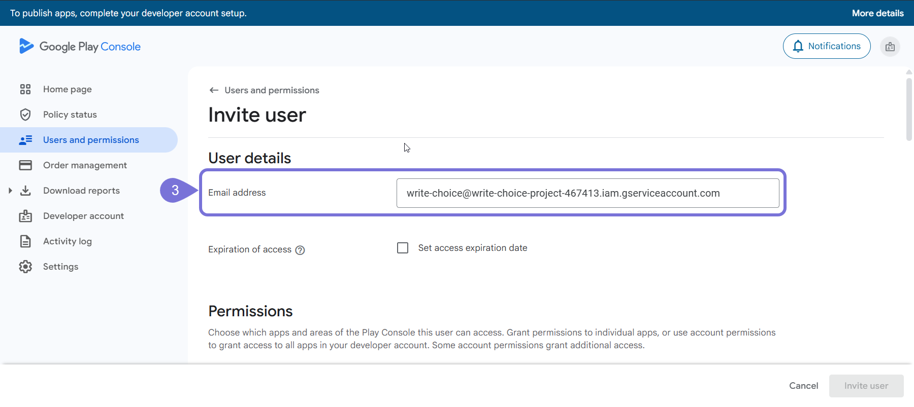 - In the pop-up window, click the Send invite button. The service account will show in the user list.