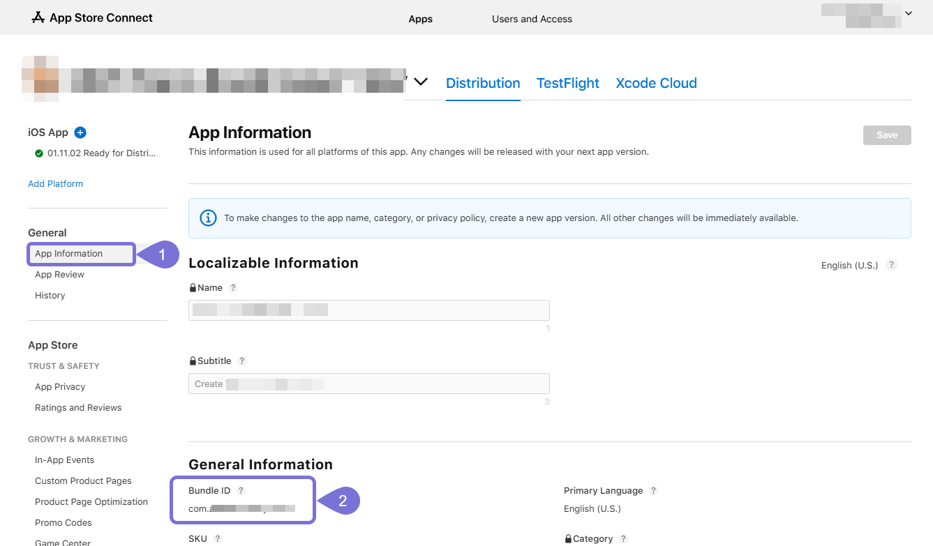 Open App Store Connect > Apps. Select your app and proceed to General > App Information section.