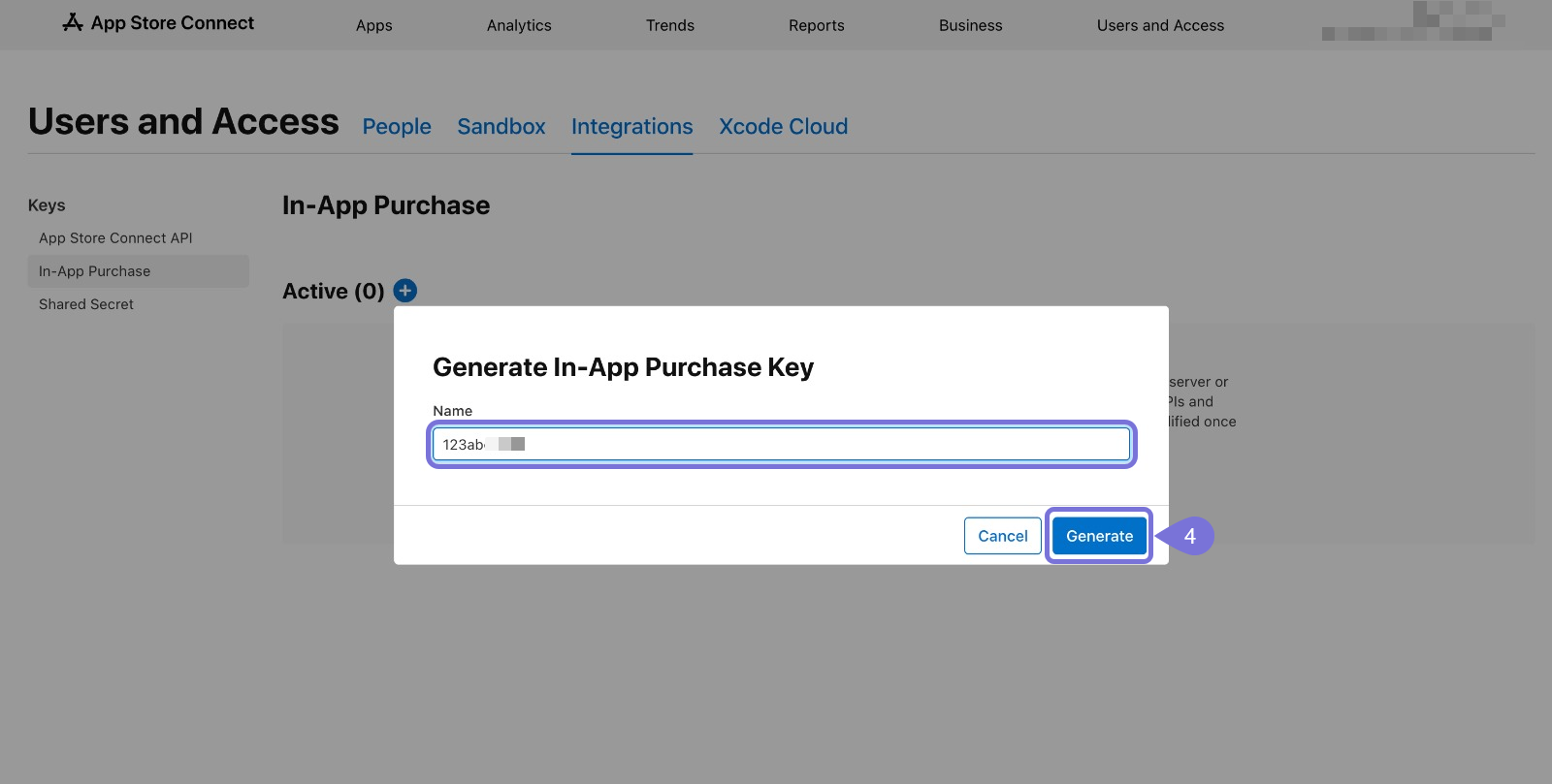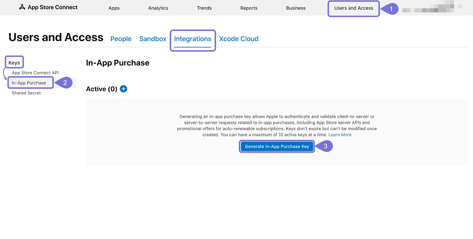 In Integrations, go to the Keys tab and select In-App Purchase.
