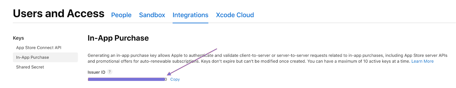 These identifiers are required for StoreKit 2 API integration. • Navigate to App Store Connect → Users and Access → Integrations → In-App Purchase • In the Active keys list: