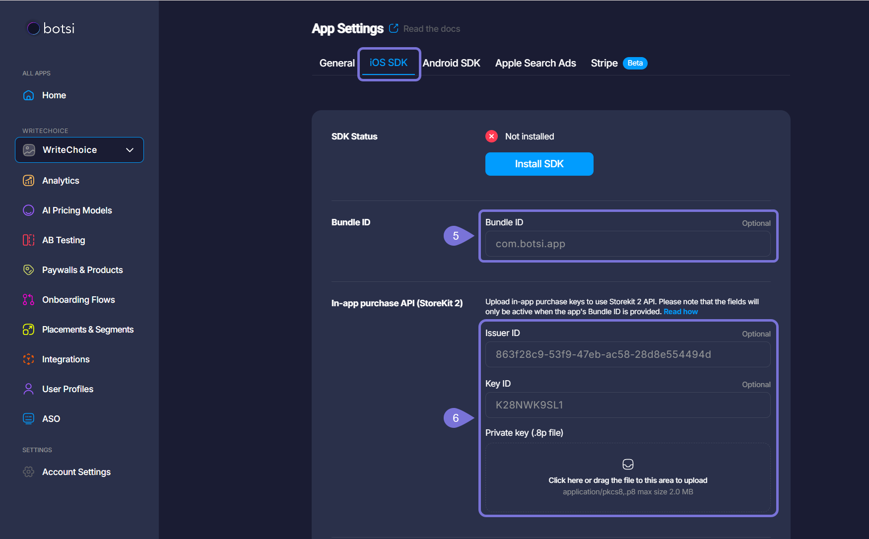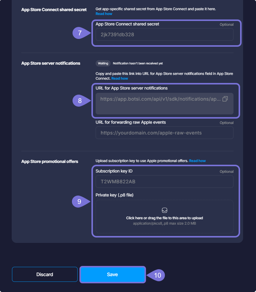 Once you have collected the necessary information from the App Store Connect, you can enter it in the Botsi dashboard as shown below.