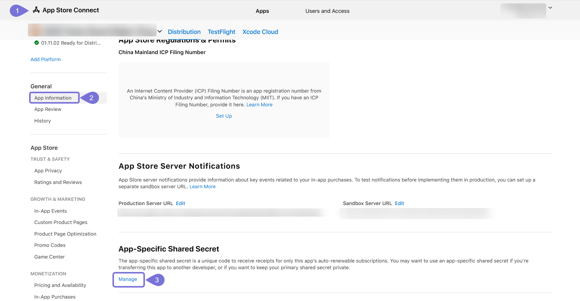 If you do not see the App-Specific Shared Secret section, ensure that your role is either Account Holder or Admin. In case you are an Admin and the section is still not visible, you will need to request the Account Holder (the individual who originally created the application in App Store Connect) to generate the shared secret. Once it has been created, the section will also appear for Admins.