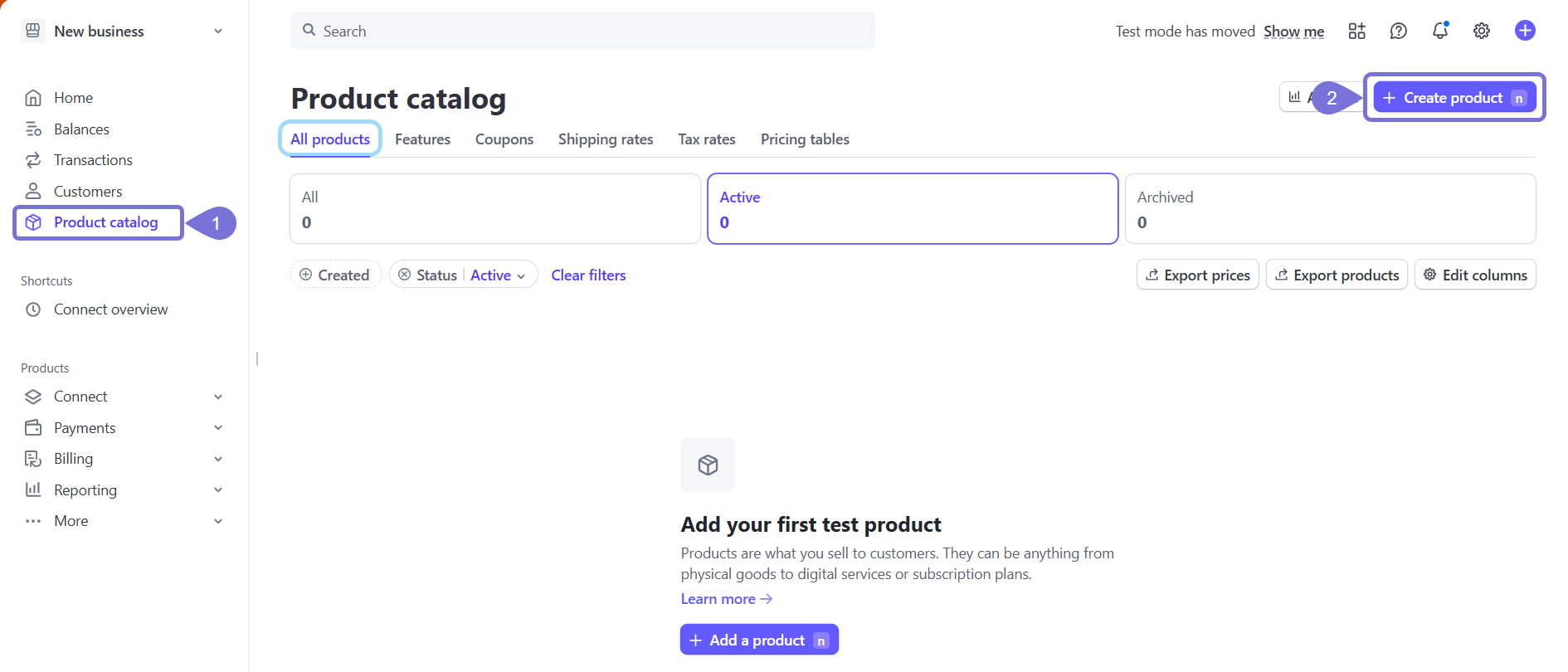 - Log in to your Stripe Dashboard and go to the Product catalog in the left menu.