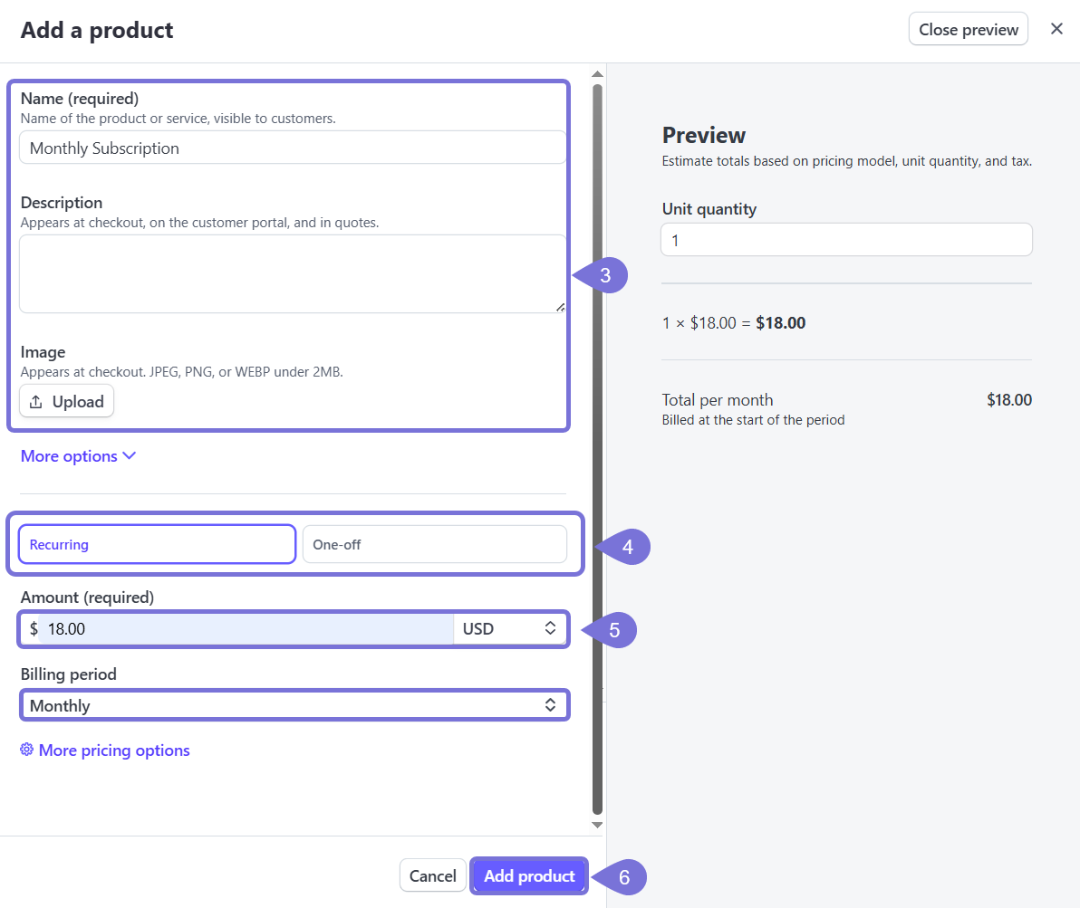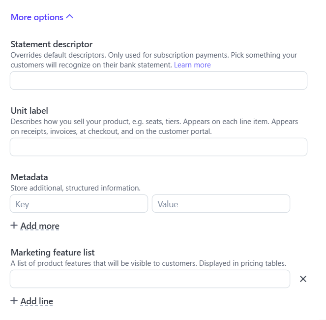 Stripe allows you to set up multiple pricing plans for each product, enabling you to offer different options without needing to create separate products. Click on More pricing options and: