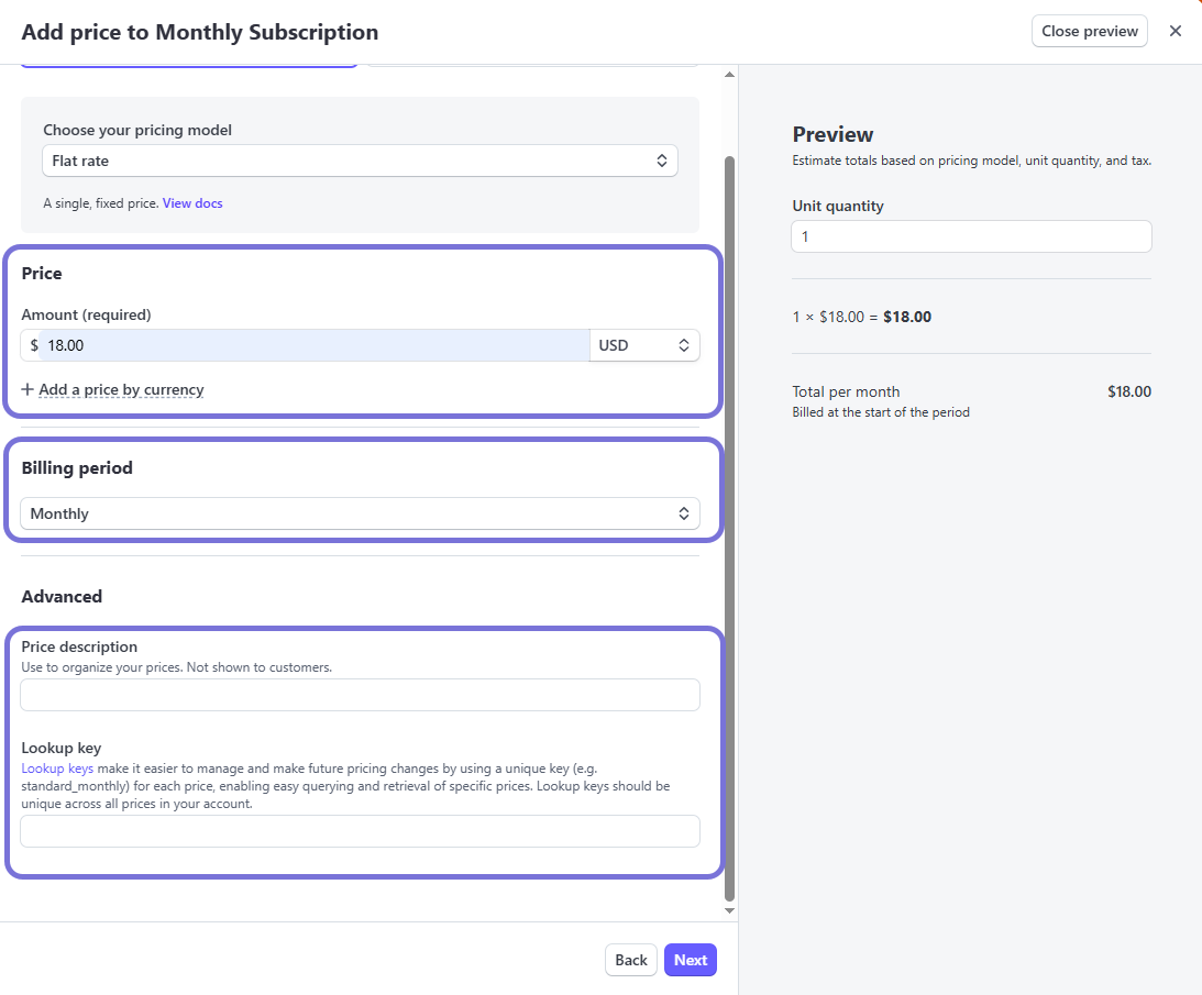 - Input a Lookup key (A unique identifier you define for this price. Useful when referencing it in your code or API calls.)