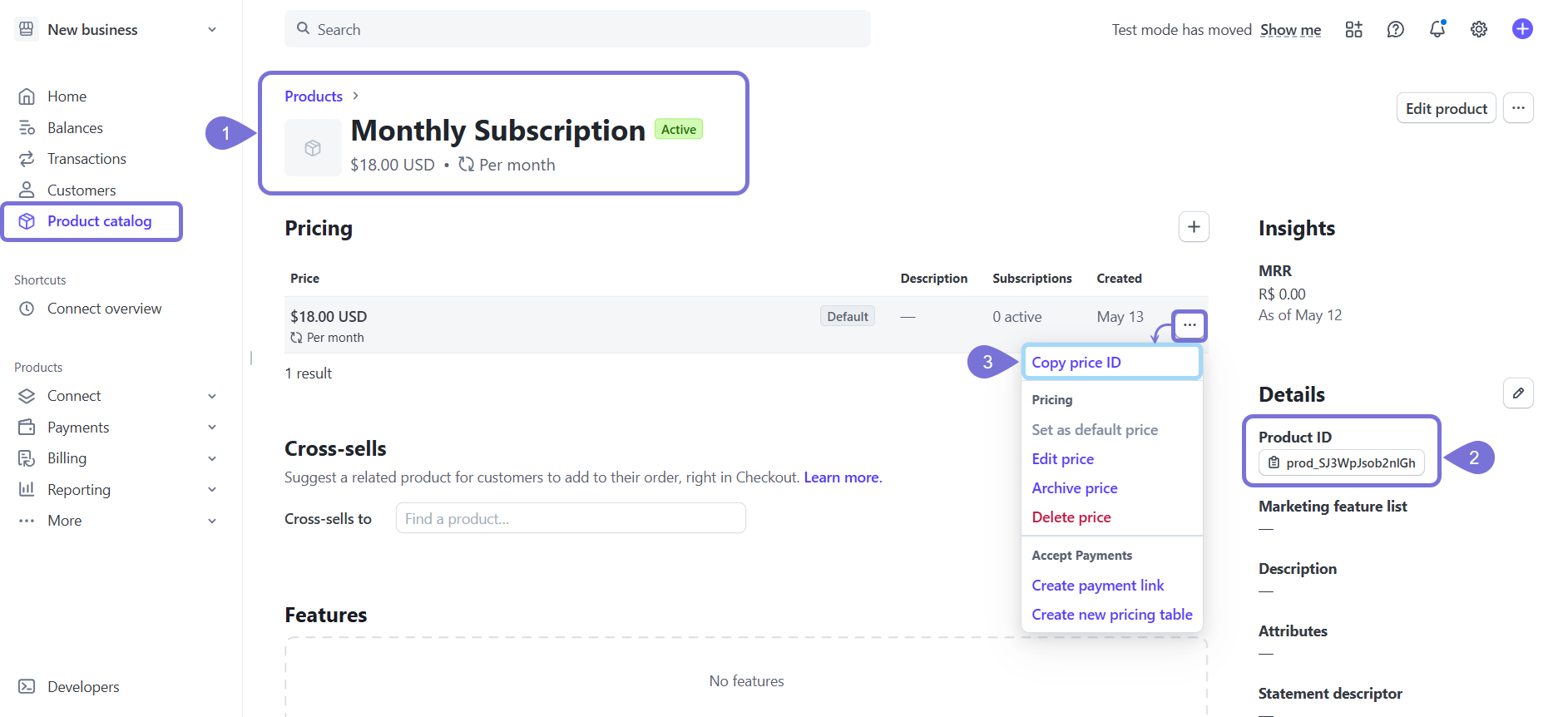 - Expand the Meatballs menu (three horizontal dots) and click on Copy price ID. Store it safely to add in Botsi.