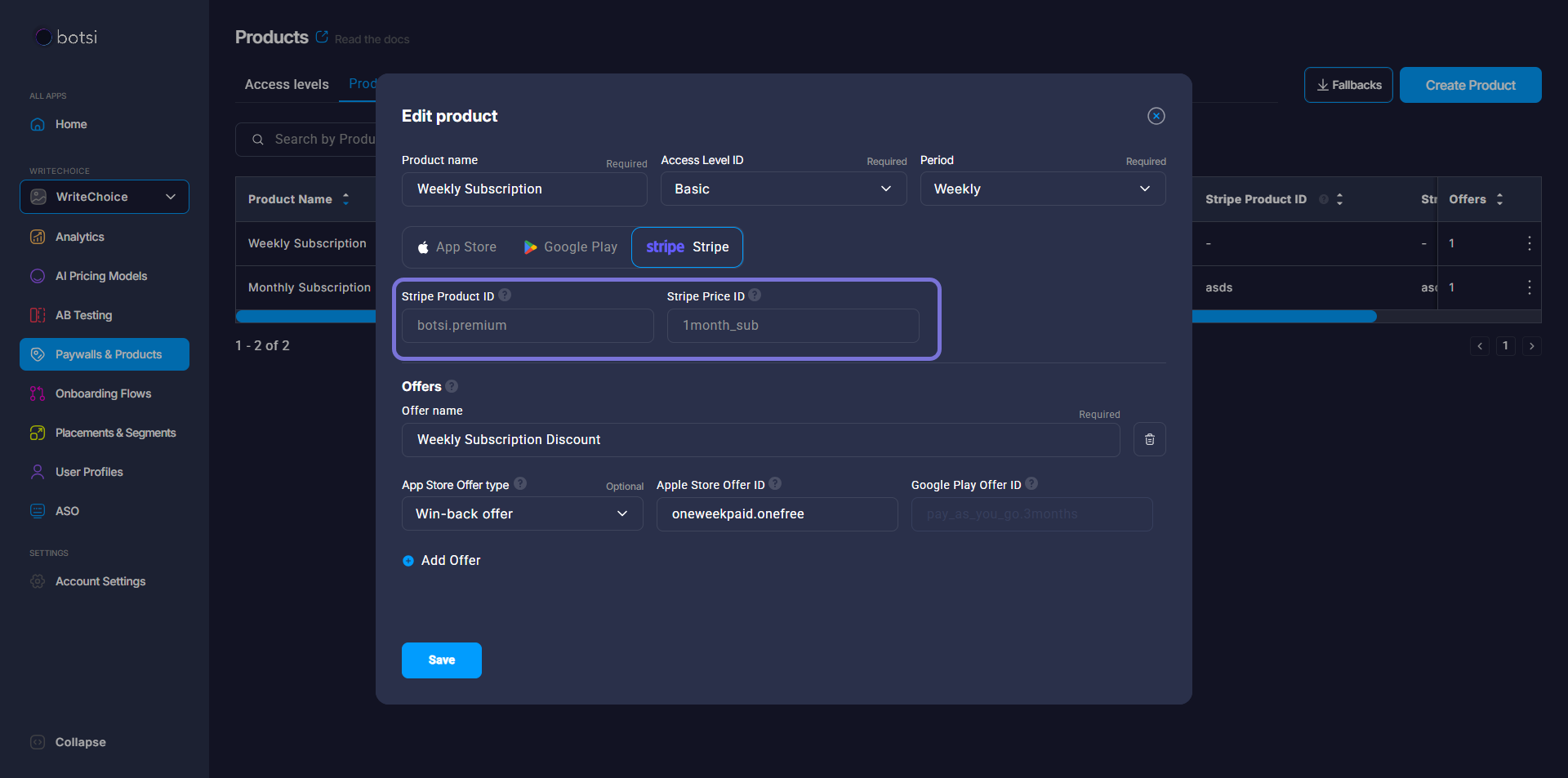Botsi treats Stripe similarly to other stores, like the App Store and Google Play. As such, you will configure it similarly by adding Stripe products (product_id and price_id) in the Products section of the Botsi Dashboard. To locate the Product and Price ID: